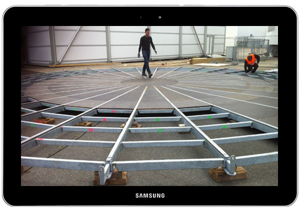 Grâce à une chape solide, les surfaces inégales ne sont jamais un problème ! Les sols sont nivelés, éliminant ainsi toutes les surfaces inégales. La structure en acier est prévue avec des tôles Betonplex anti-dérapantes. Selon les normes requises, la structure du dôme est fixée au sol.